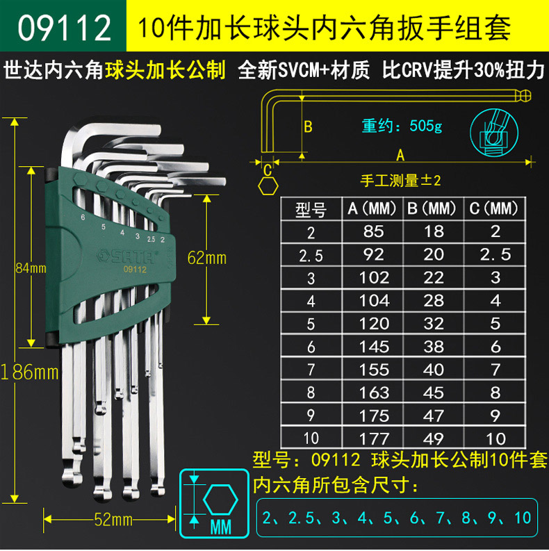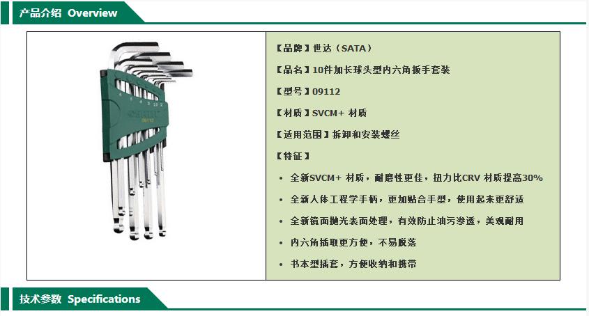 SATA世达 内六角扳手套装,10件加长球头型,09112