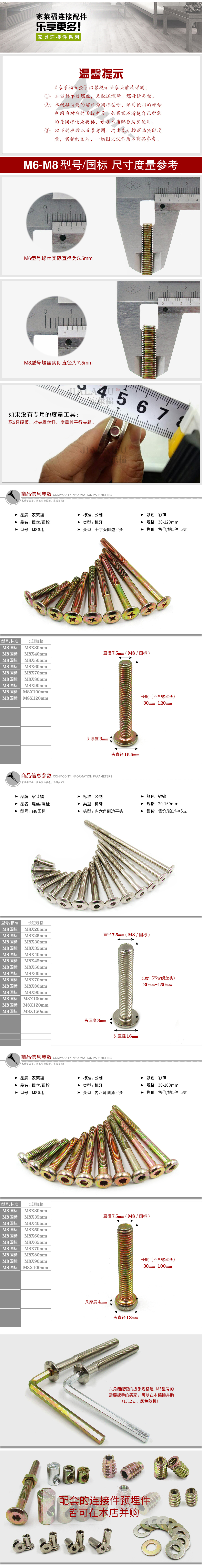 家莱福 M8国标 倒边平头内六角机螺钉 子母床实木床连接件桌椅紧固件 十字头螺栓 机螺丝钉 内六角彩